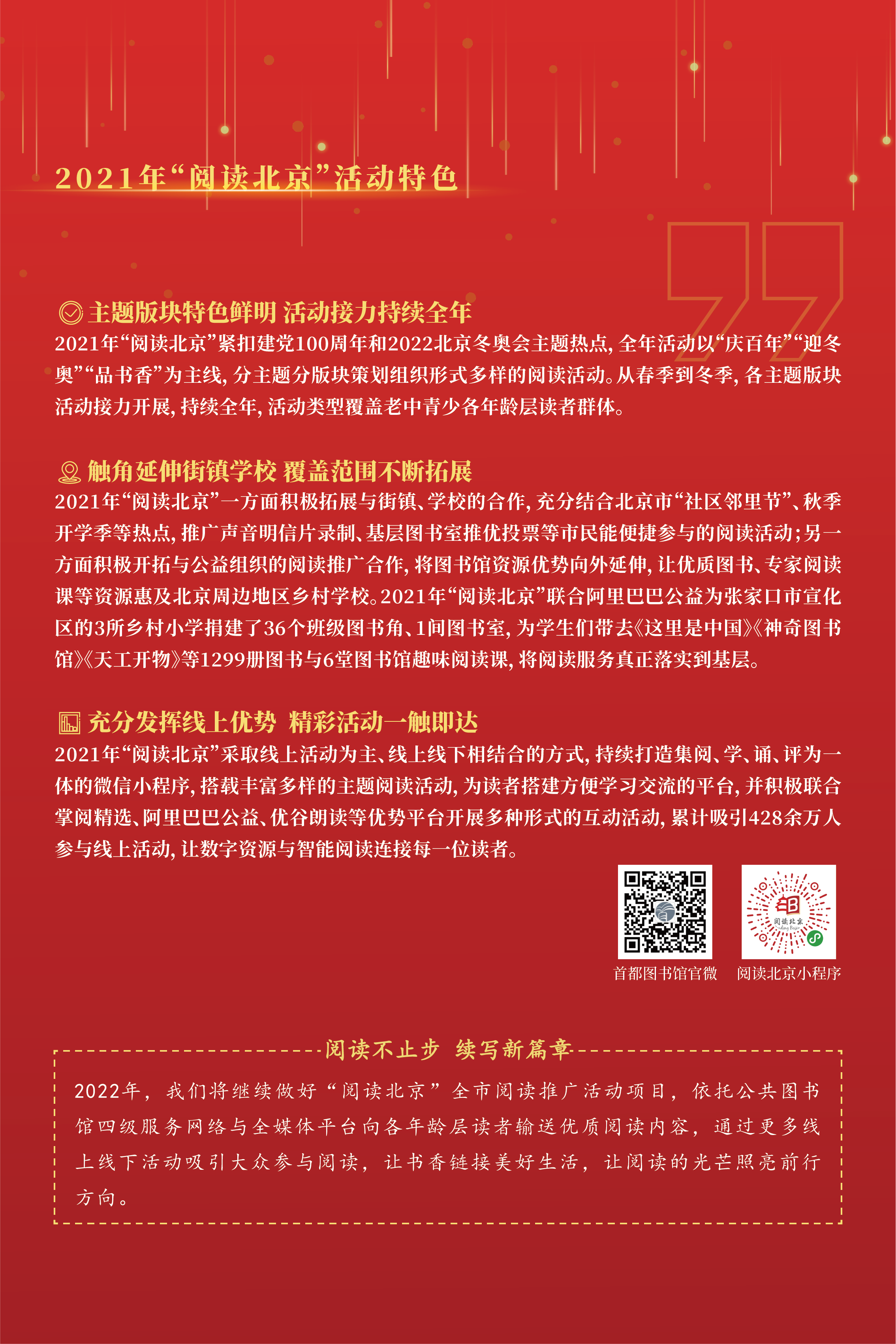 北京市文旅局副局长庞微致辞中提到,首都图书馆作为市级 “龙头馆”,负责统筹指导全市公共图书馆的规划、建设和发展。首都体育学院是体育人才的摇篮,培育出众多的世界冠军和全国冠军。这次,两家强强联合,突出冬奥特色,共同建设首都图书馆体育分馆奥运书屋,既宣传了体育运动和奥林匹克精神,又为市民和师生提供了一处阅读好去处,增添了城市文化色彩。